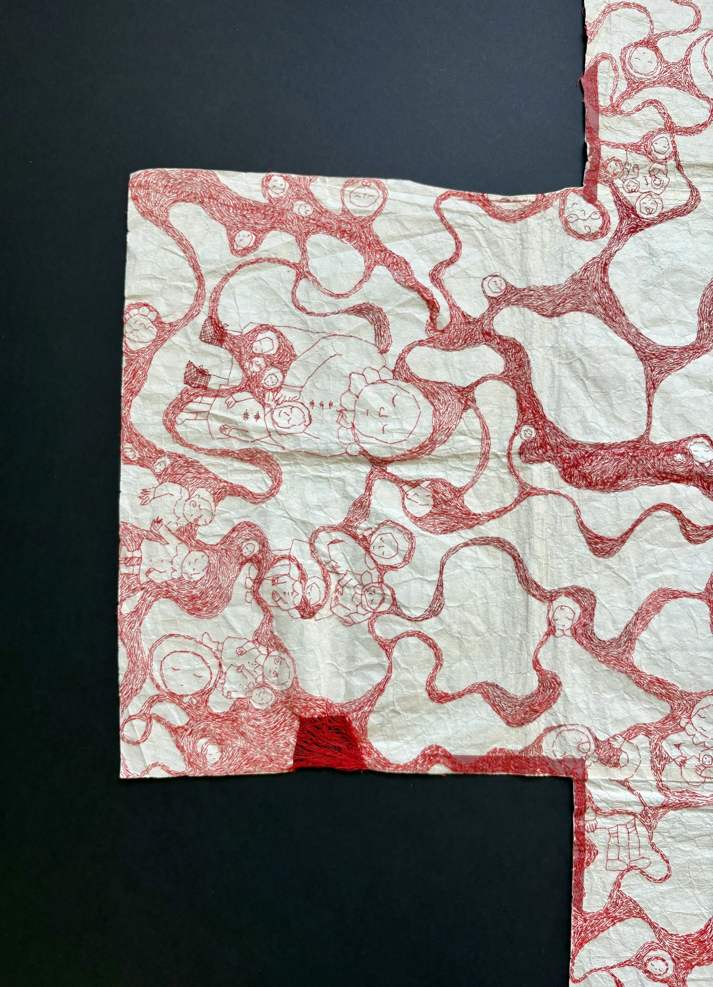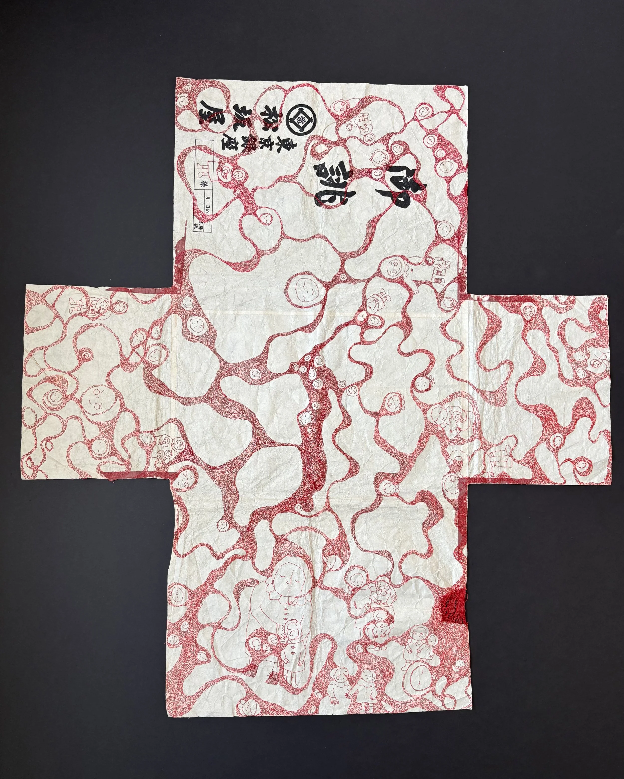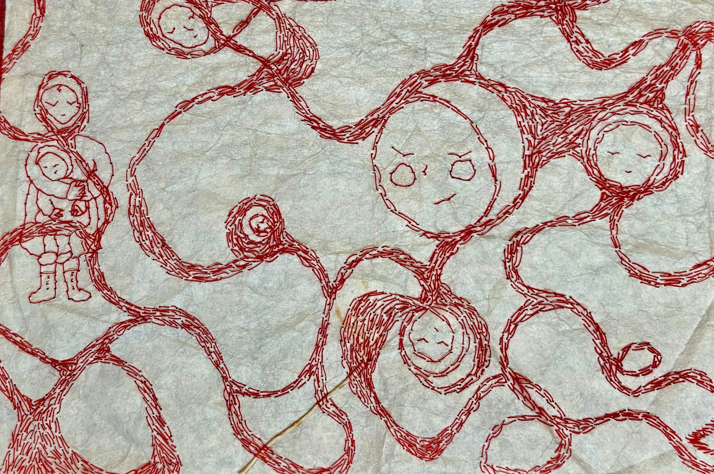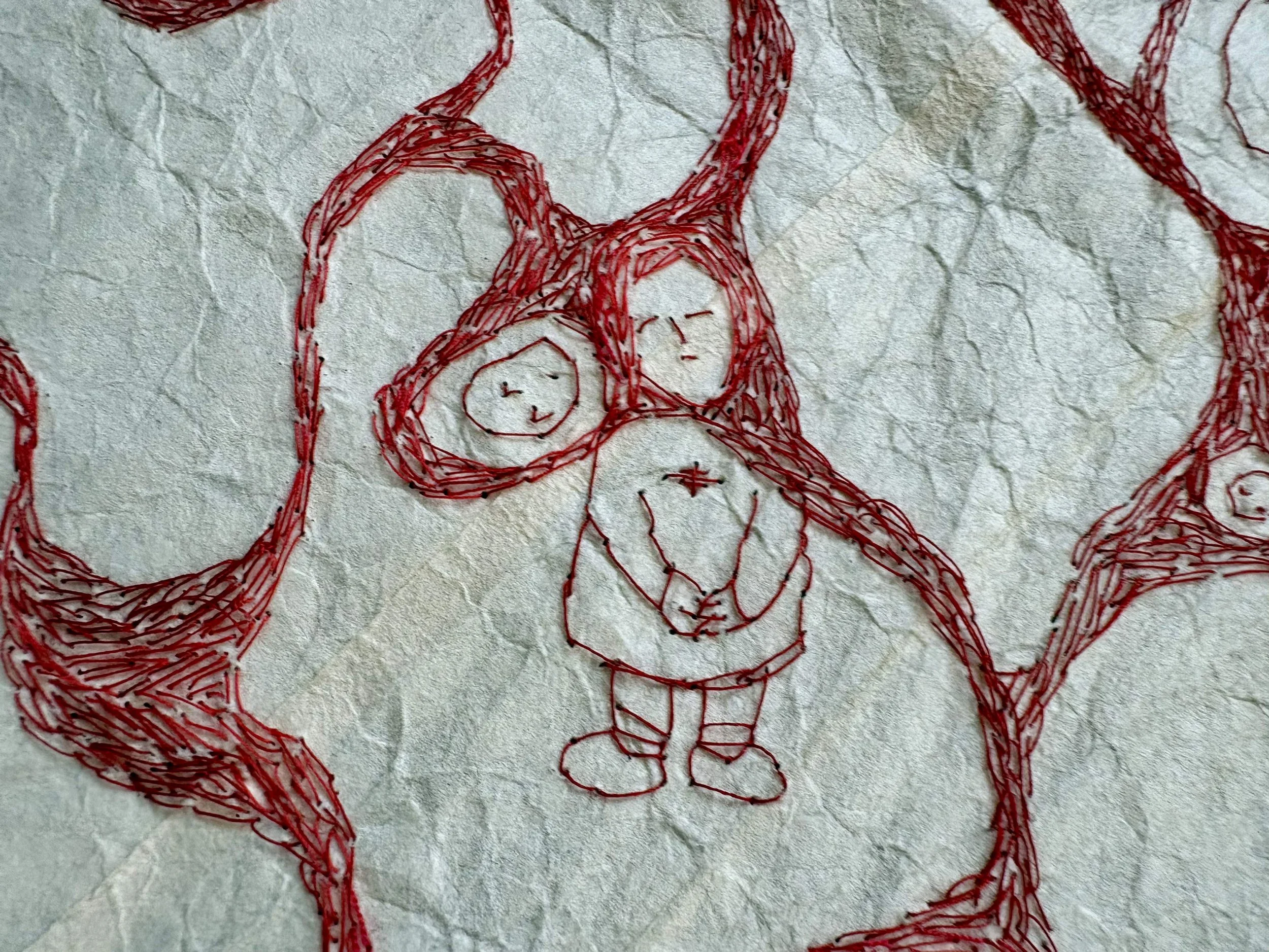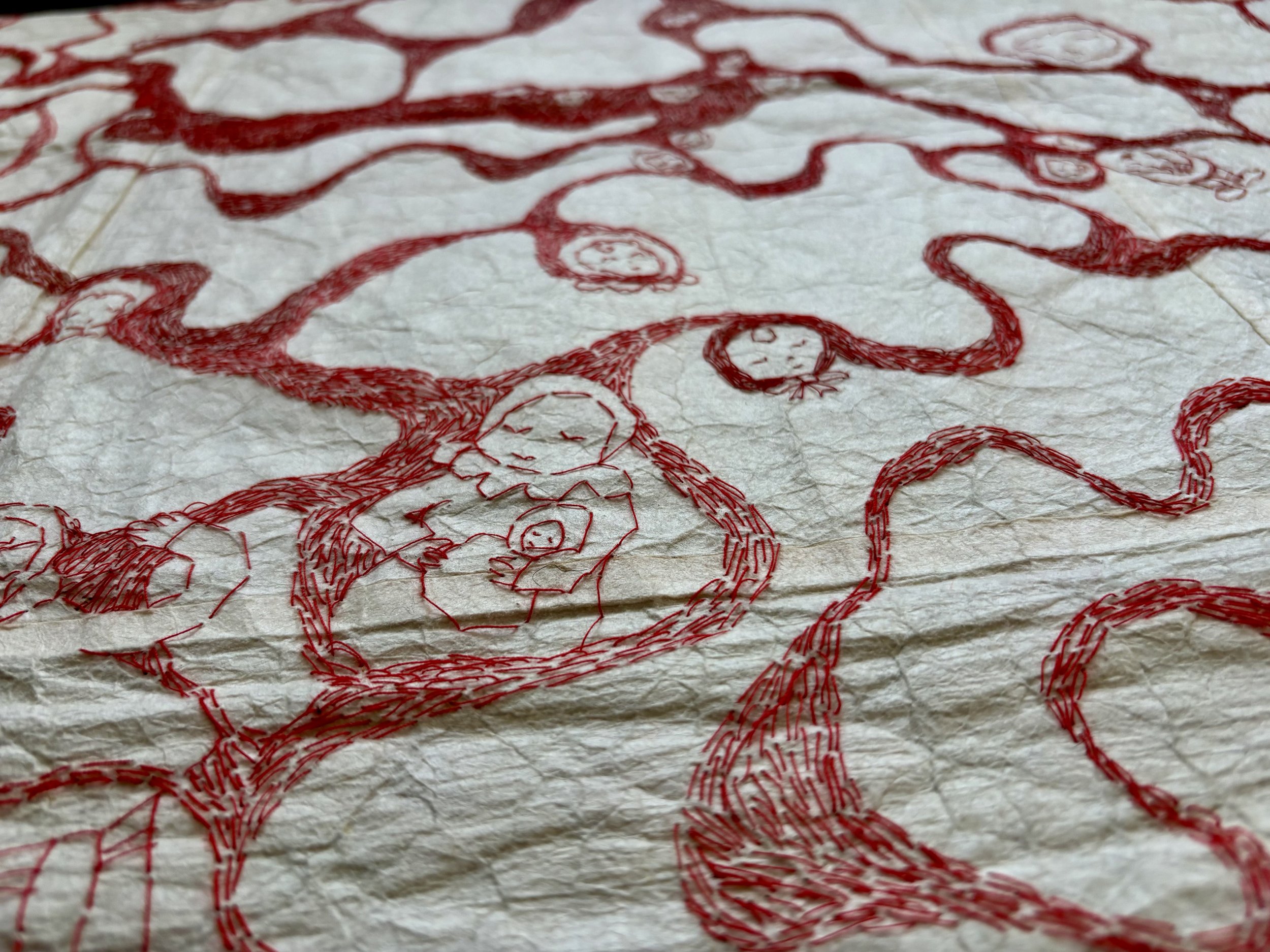 red and maroon sewing thread, stripped red embroidery floss, tatoshi paper.