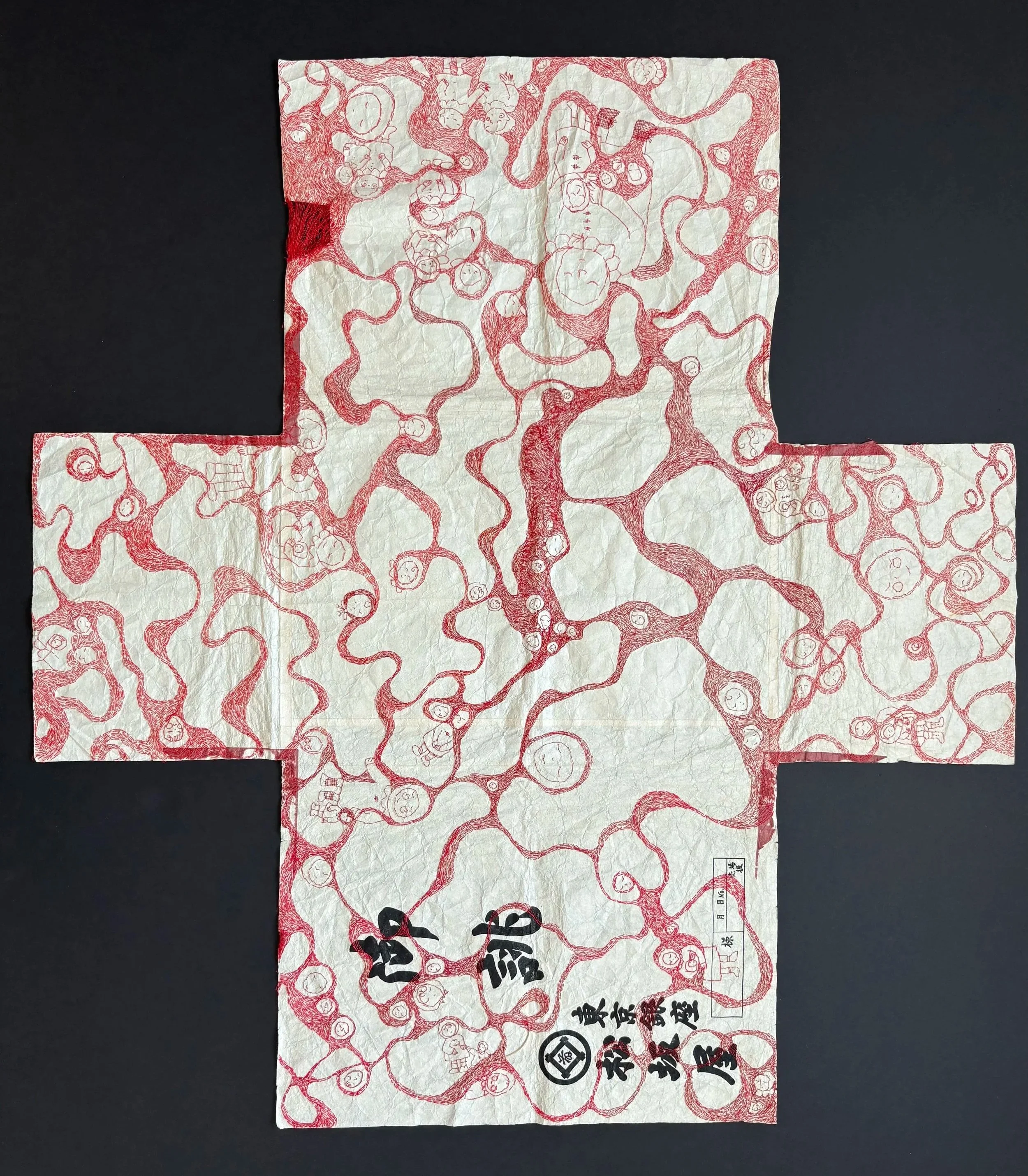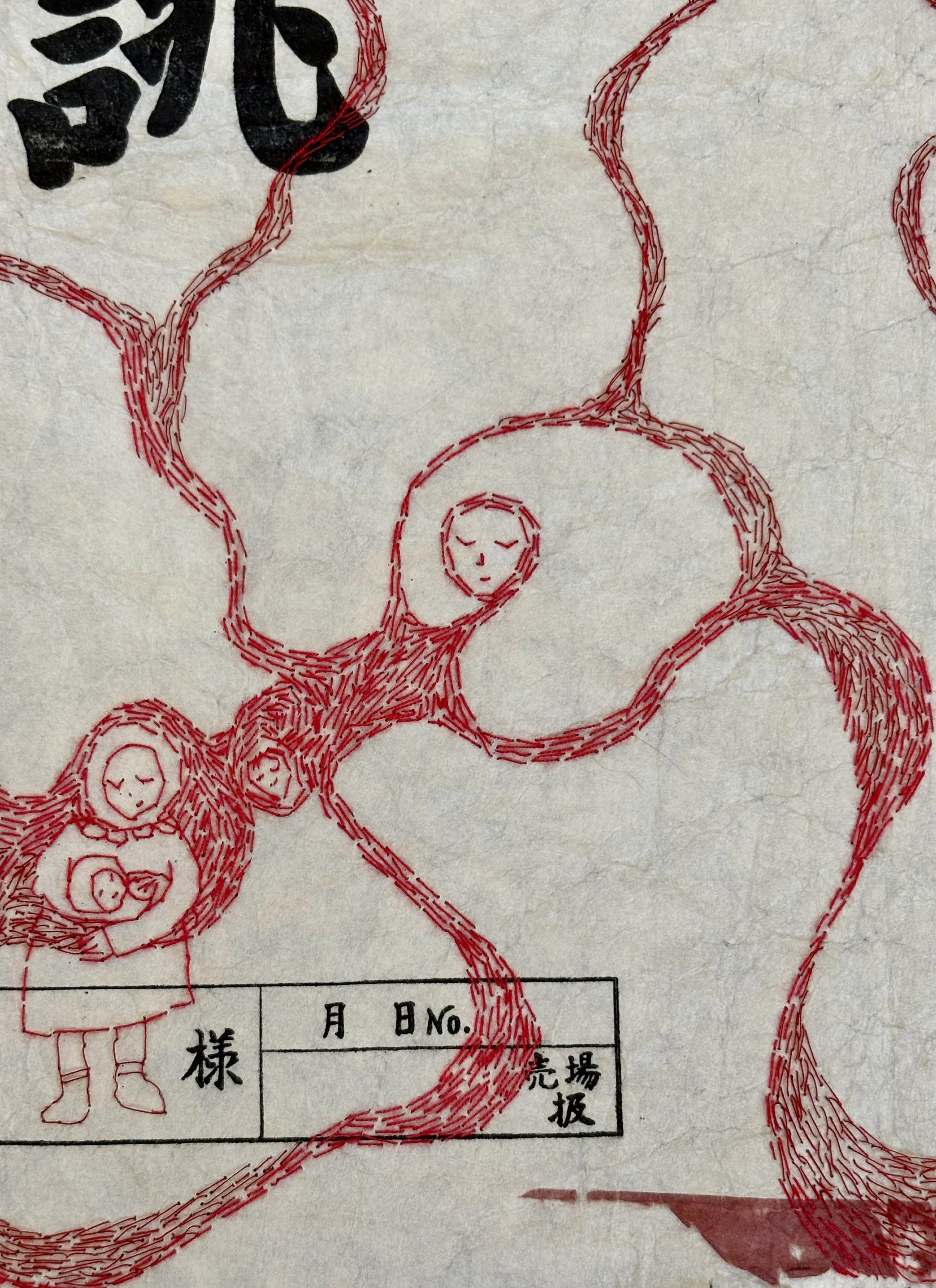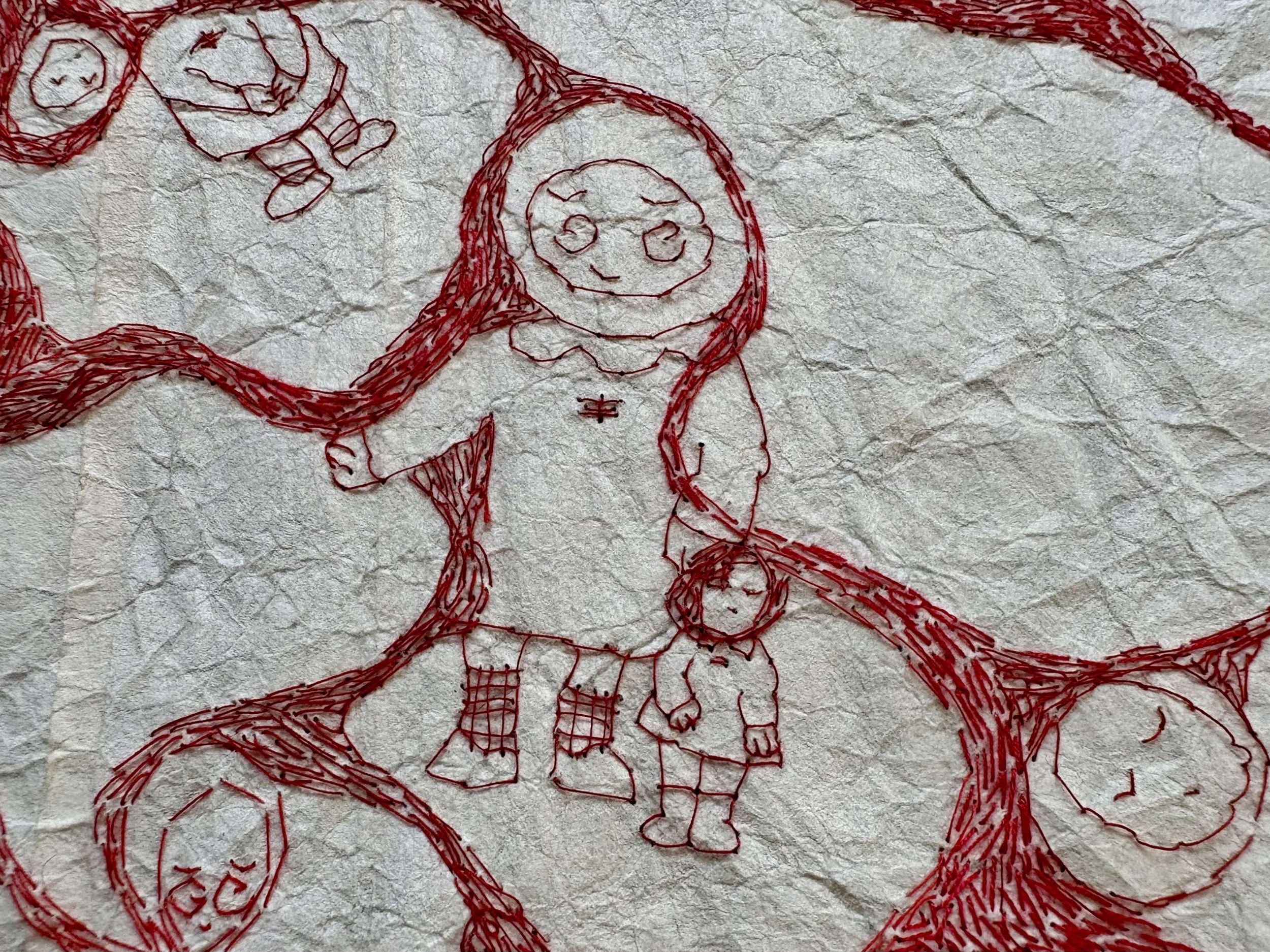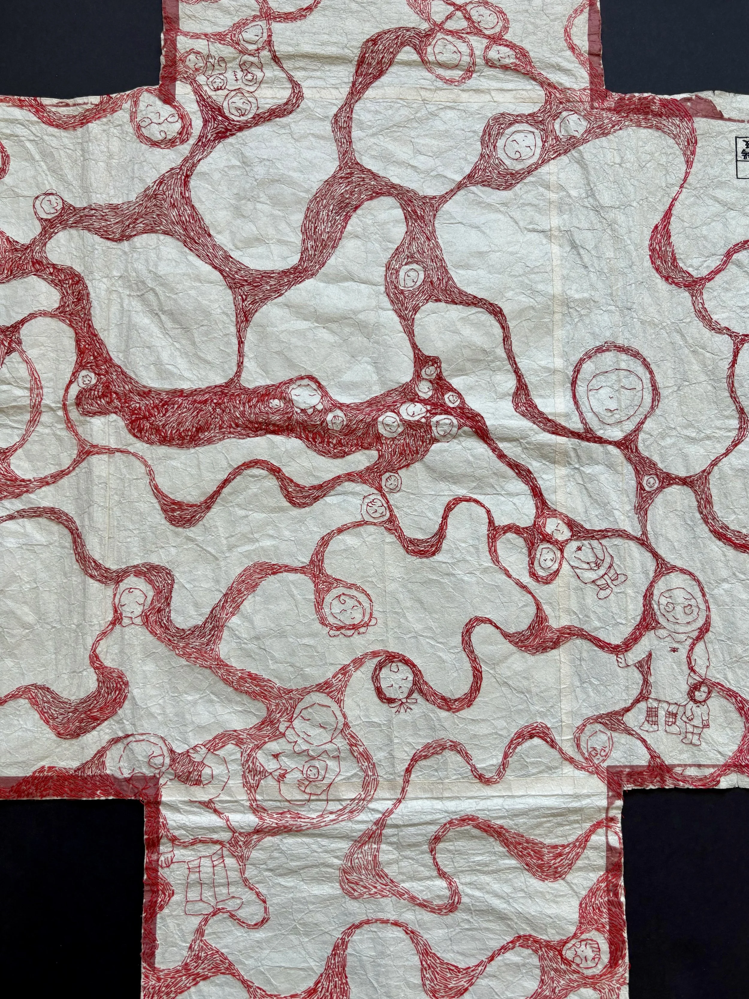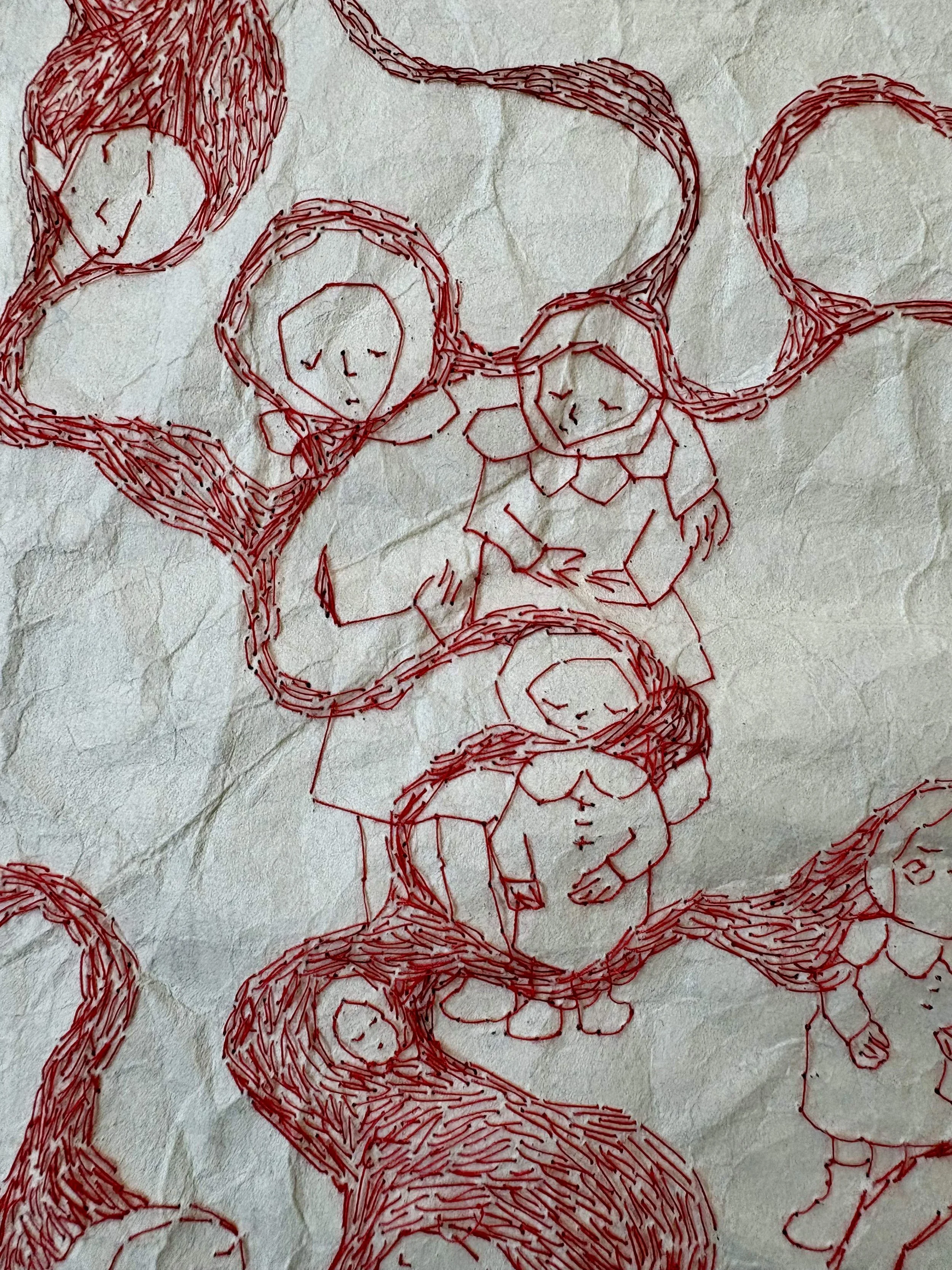 red and maroon sewing thread, stripped red embroidery floss, tatoshi paper.