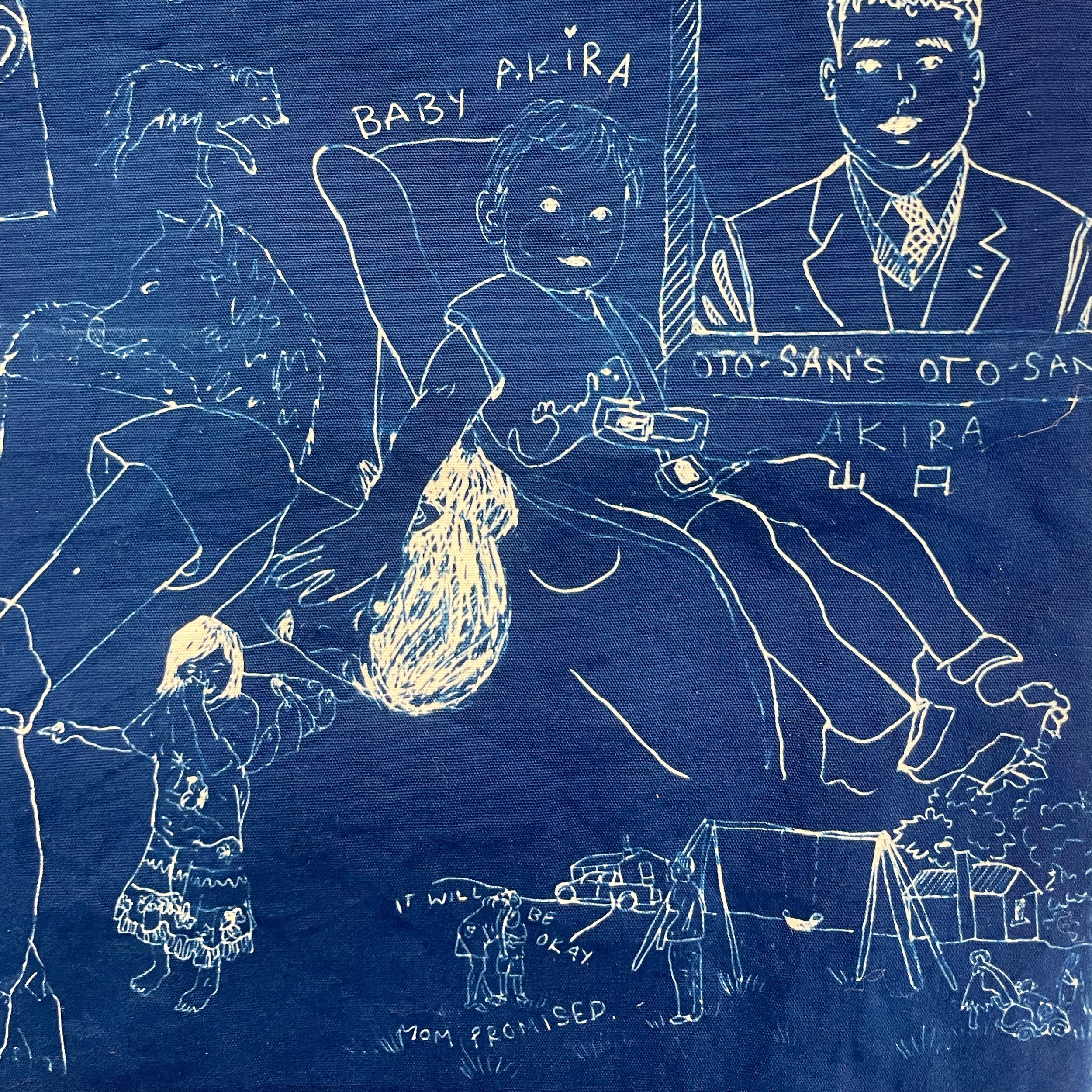 collage of family photographs and childhood picture books, cyanotype on cotton