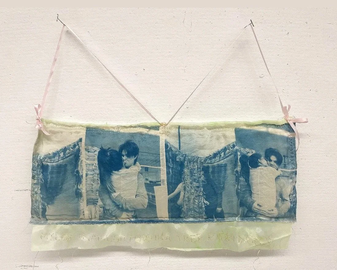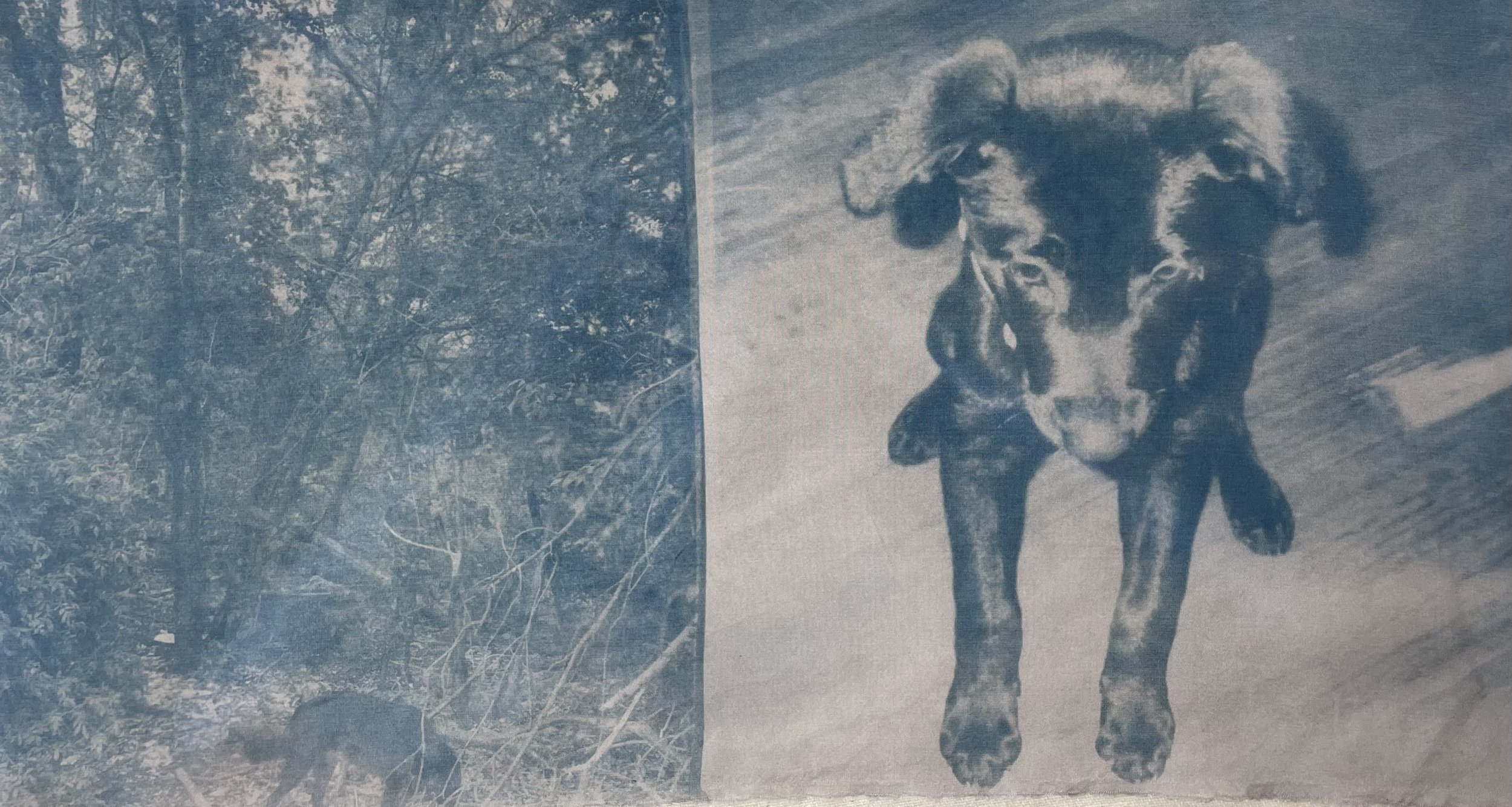 left: 10 years old, right: a puppy. cyanotype on silk, 2024.